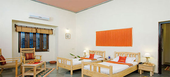Aranyawas offers its guests comfortable accommodation in 15 Cottages, 4 Deluxe room and 2 Tents. Rooms are spacious and they are decorated in the 'Paysan' style with gentle, rustic colours and elegant decor. From the balconies guests can enjoy spectacular views of the valley and the river. In-room amenities include: music system, tea/coffee maker, mineral water, telephone service, heaters, fruit basket/cookies, balcony/ sit out, and attached bathroom with hot/cold water.